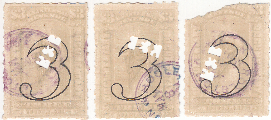 Through the first years of the 1898 tax period, Rolston & Bass carried on a brokerage as named partners, along with the unnamed Edwin Hooley. By 1901, however, Bass ceased to be a part of the firm. See the handstamped cancels below for Rolston & Hooley, combined with the old R&B die cut cancels.