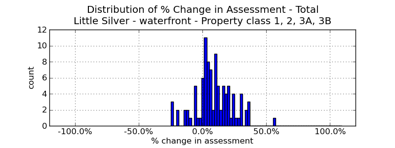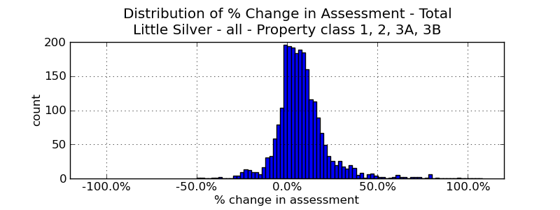 The histograms below shows the distribution of the change in total assessment. Others for just land and improvements are linked in the table at the end. The few outlying changes exceeding +/-110% are silently reduced to +/-110%.