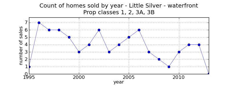 This is why the small change of smoothing and fiscal year boundaries made such a big difference. Other small changes such as adding or removing a sale or two would do likewise. And so while "waterfront properties decreased in value by 33.92% from 2003 to 2012" had a nice ring to it, especially in the context of a discussion about rising valuations, in fact it was meaningless. Moreover, any statement about average long-term change of sales price of the data at hand, while mathematically correct, is meaningless as an indication of actual sales trends and thus, as a basis for valuation.