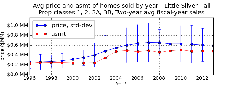In most cases I've used the deed date and calendar year for classifying sales. This is slightly more natural and intuitive than the fiscal year (July 1 -> June 30) and recording date used by the County. Because of this the data is not directly comparable to that used in the computation of the Director's Ratio and Coefficients of Deviation. The purpose of this study was not to duplicate the County ratios and equalization tables - I'm confident they are done correctly according to statue. Where I did compare results with County numbers they were close but to do any better would require running this analysis software on the identical data set as used by the county (difficult, since it is constantly changing) and probably algorithmic refinements not applicable for my objectives. I did use fiscal year and recording date when exploring the effects of data smoothing with a two-year average of the sale price as that more closely matched County algorithm.